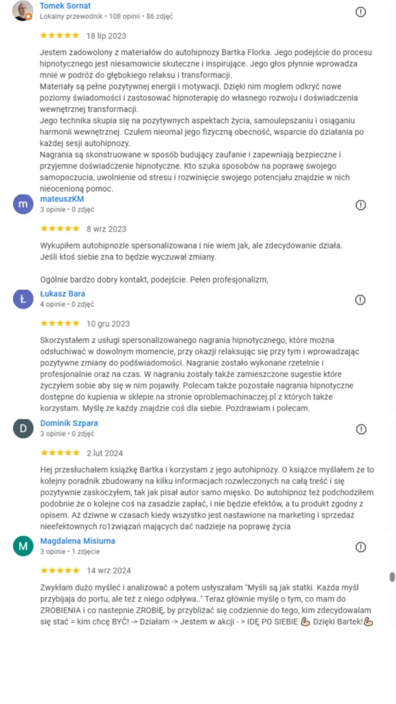 Hipnoza to bezpieczne i sprawdzone narzędzie, które umożliwia „przeprogramowanie” Twojego umysłu, zamieniając ograniczające przekonania na takie, które wspierają Twoje cele. Proces jest całkowicie pod Twoją kontrolą — akceptujesz tylko to, na co sobie pozwolisz.